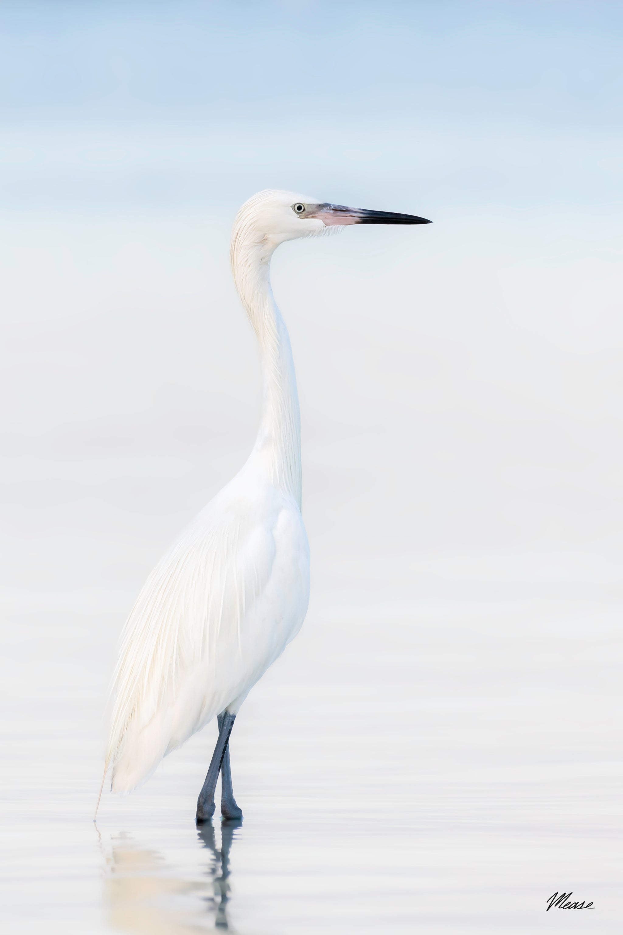 In the cool sunrise mist, a white morph reddish egret pauses from its morning hunt. The soft haze created an ethereal, dreamlike backdrop.